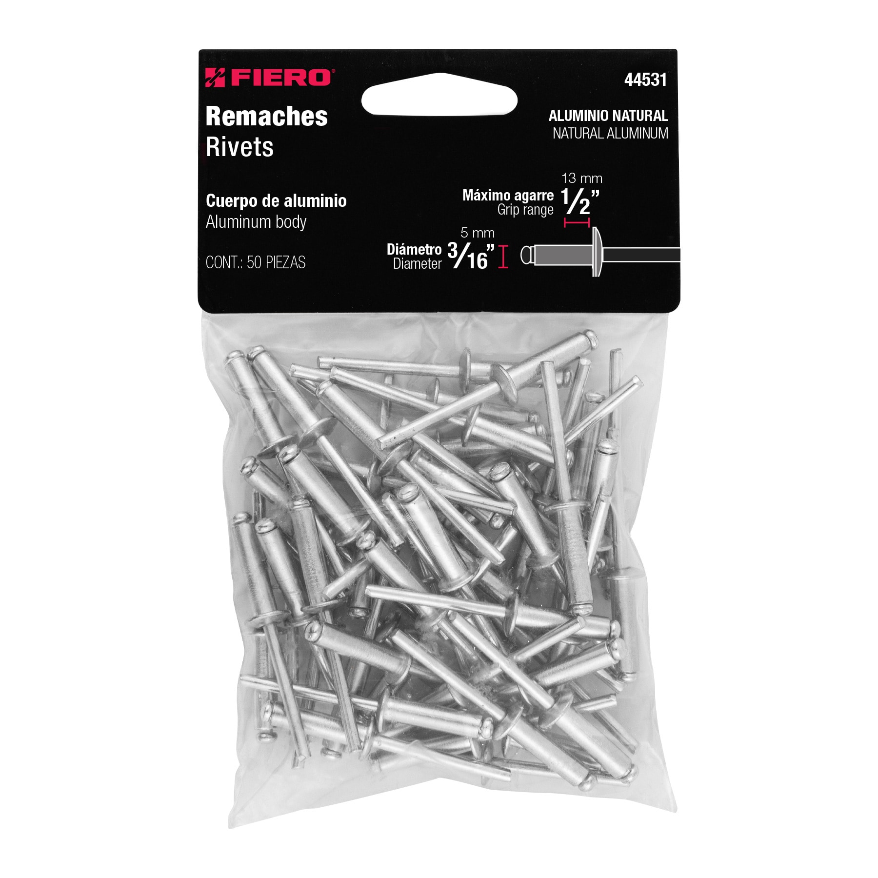Remache pop de aluminio de 3/16″ de diámetro por 1/2″ de largo. Bolsa con 50 piezas para fijación rápida en lámina o metal.