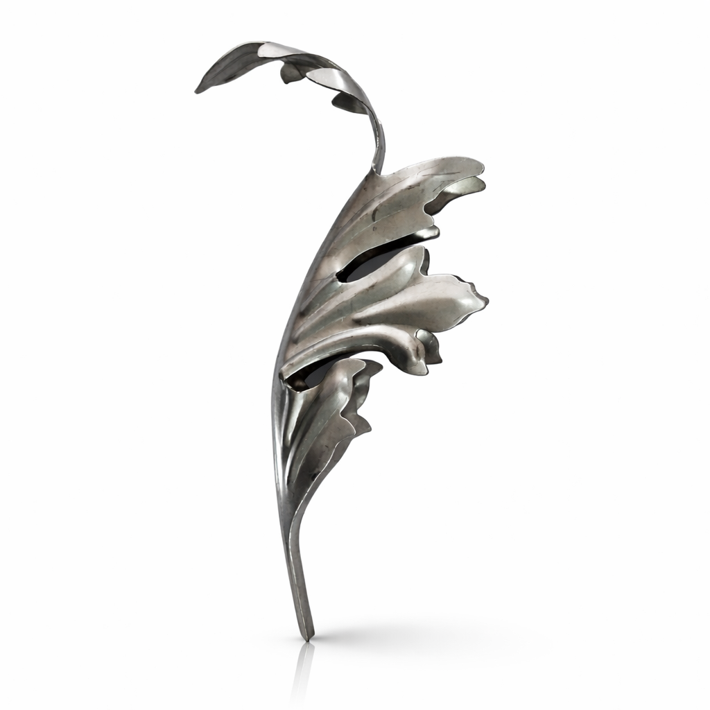 Ornamento decorativo para herrería fabricado en lámina de acero estampada, con diseño tipo hoja/flor de líneas orgánicas y relieve definido. Ideal para portones, rejas, barandales, puertas y proyectos de forja, aportando un acabado elegante y profesional. Listo para soldar y pintar según el acabado deseado.
