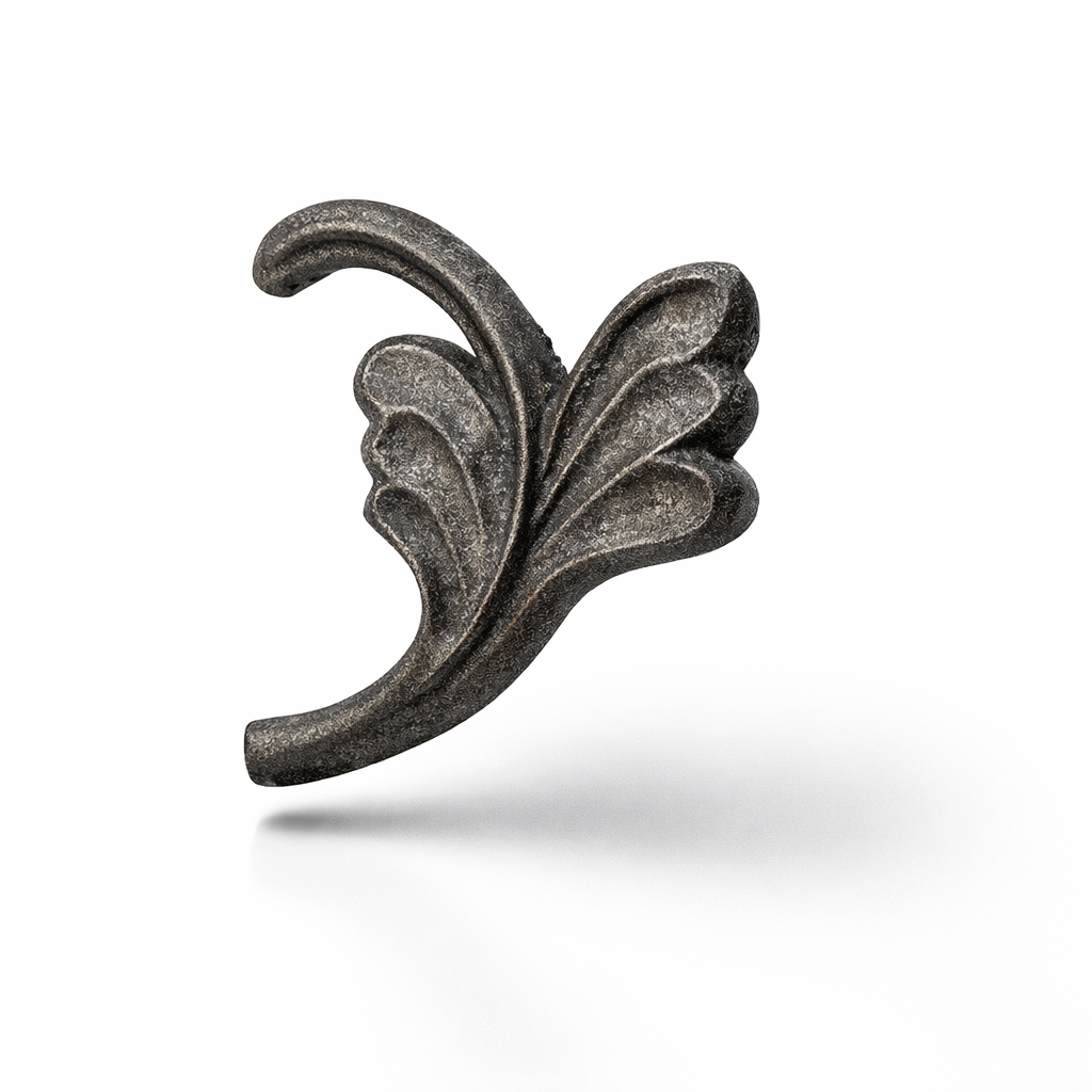 Hoja maleable de fierro vaciado modelo 4517, medida 80 x 72 mm. Pieza ornamental ideal para herrería artística en portones, rejas, barandales y muebles metálicos. Fabricada en fierro maleable, es fácil de soldar y se puede pintar o dar acabado para interior o exterior. Venta por pieza.