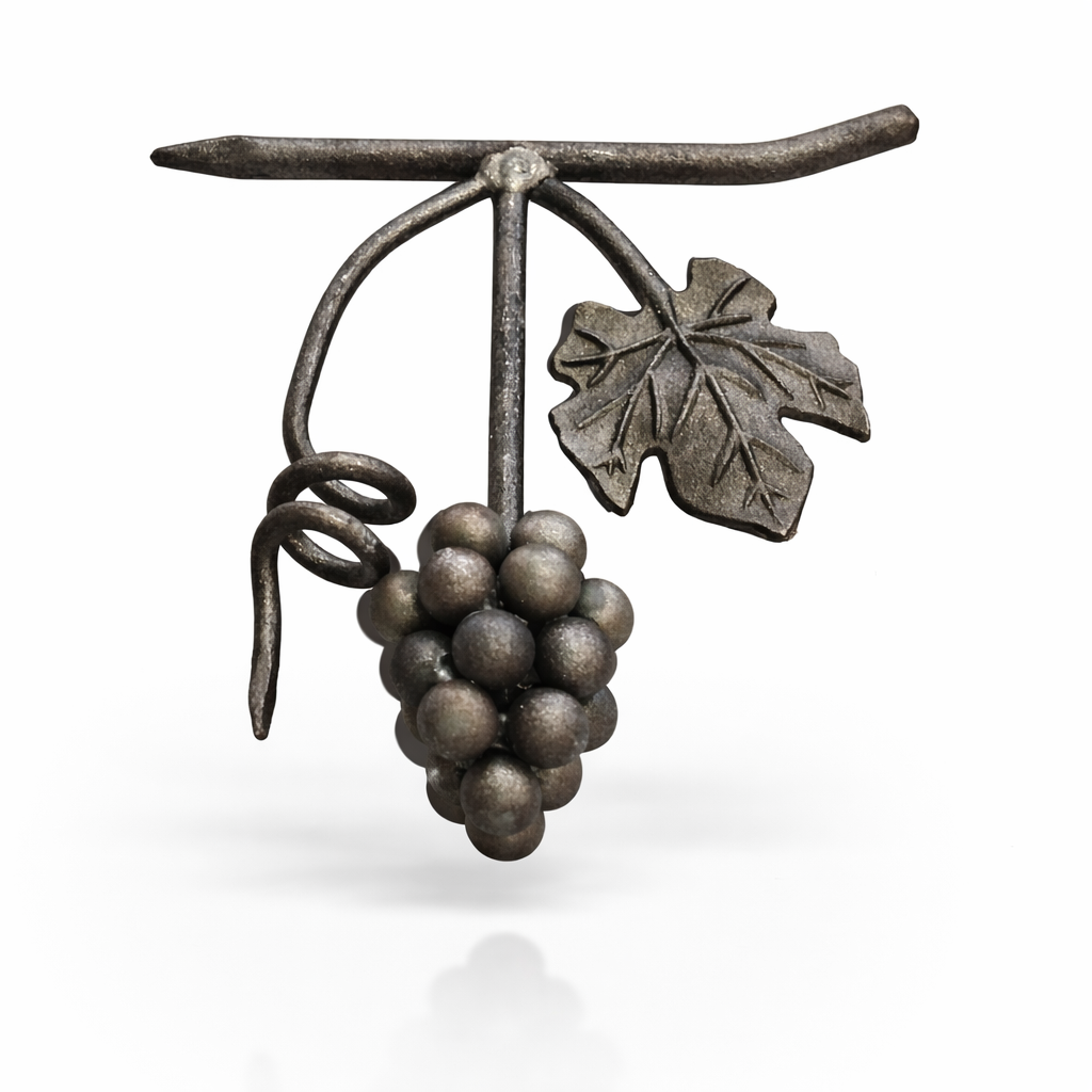 Figura decorativa modelo 5666 con diseño de racimo de uvas y hoja, hecha de fierro vaciado. Ideal para herrería ornamental por su relieve y detalle, perfecta para portones, barandales, rejas y muebles metálicos. Medida: 180 x 180 mm. Venta por pieza.