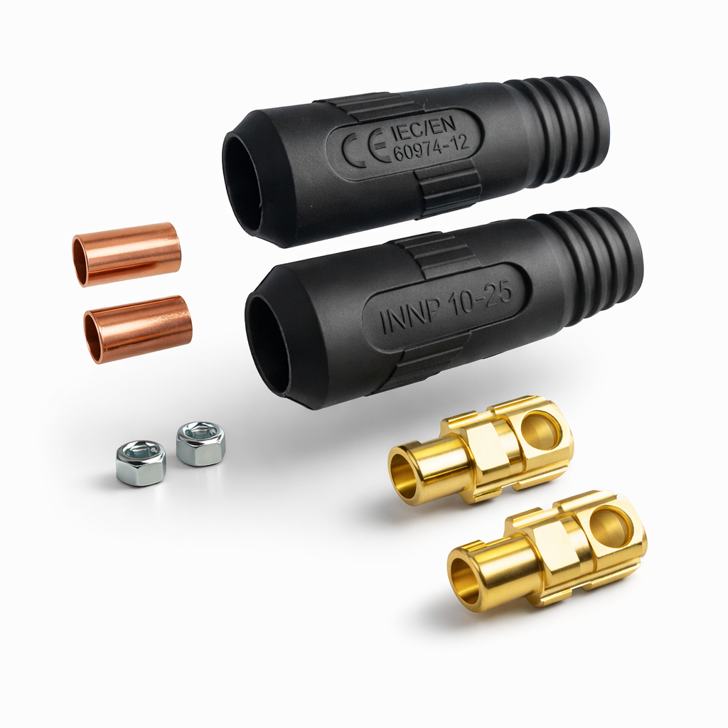 Este par de bornes machos de 3/8” está diseñado para conectar de forma segura los cables del electrodo con la máquina de soldar, asegurando un ajuste firme y una buena conducción de corriente. Ideal para trabajos de soldadura donde se requiere una conexión confiable y resistente al uso continuo. Incluye 2 piezas (1 par).